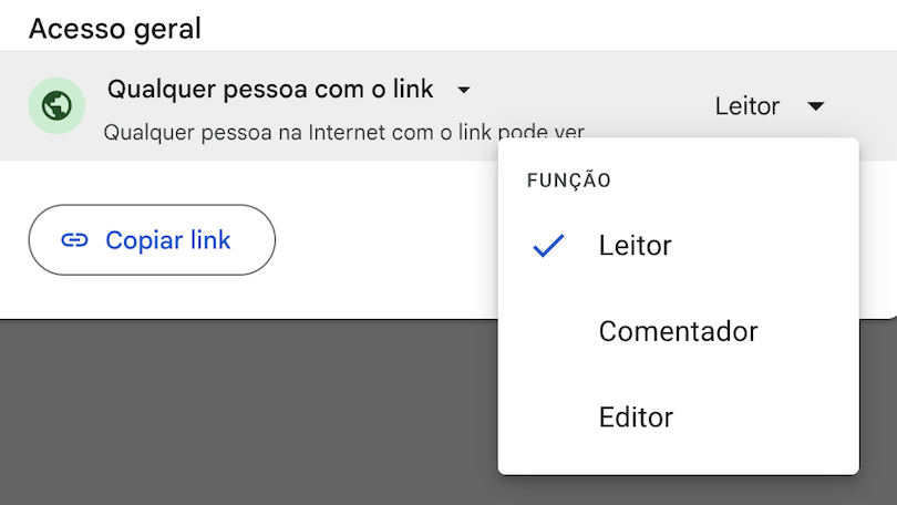 Vai abrir uma janela, você vai ver “Acesso geral”, altere para "Qualquer pessoa com o link".