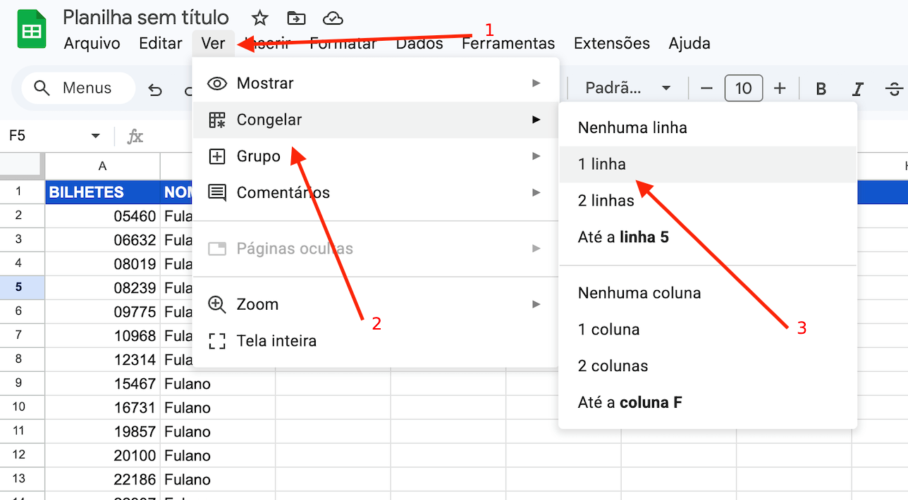 Depois no menu superior clique em: Ver → Congelar → 1 linha.