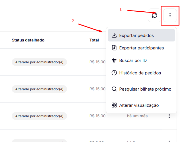 Na página de pedidos da sua campanha no painel do Rifei, clique nos três pontinhos no canto superior direito, e clique em "Exportar Pedidos". Selecione somente os dados "Bilhetes" e "Nome", e exporte o arquivo em formato .CSV.