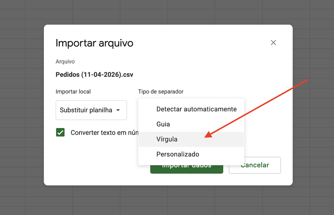 Importe o arquivo .CSV que você baixou no Rifei em uma planilha em branco no Google Planilhas, selecione o delimitador como "Vírgula".
